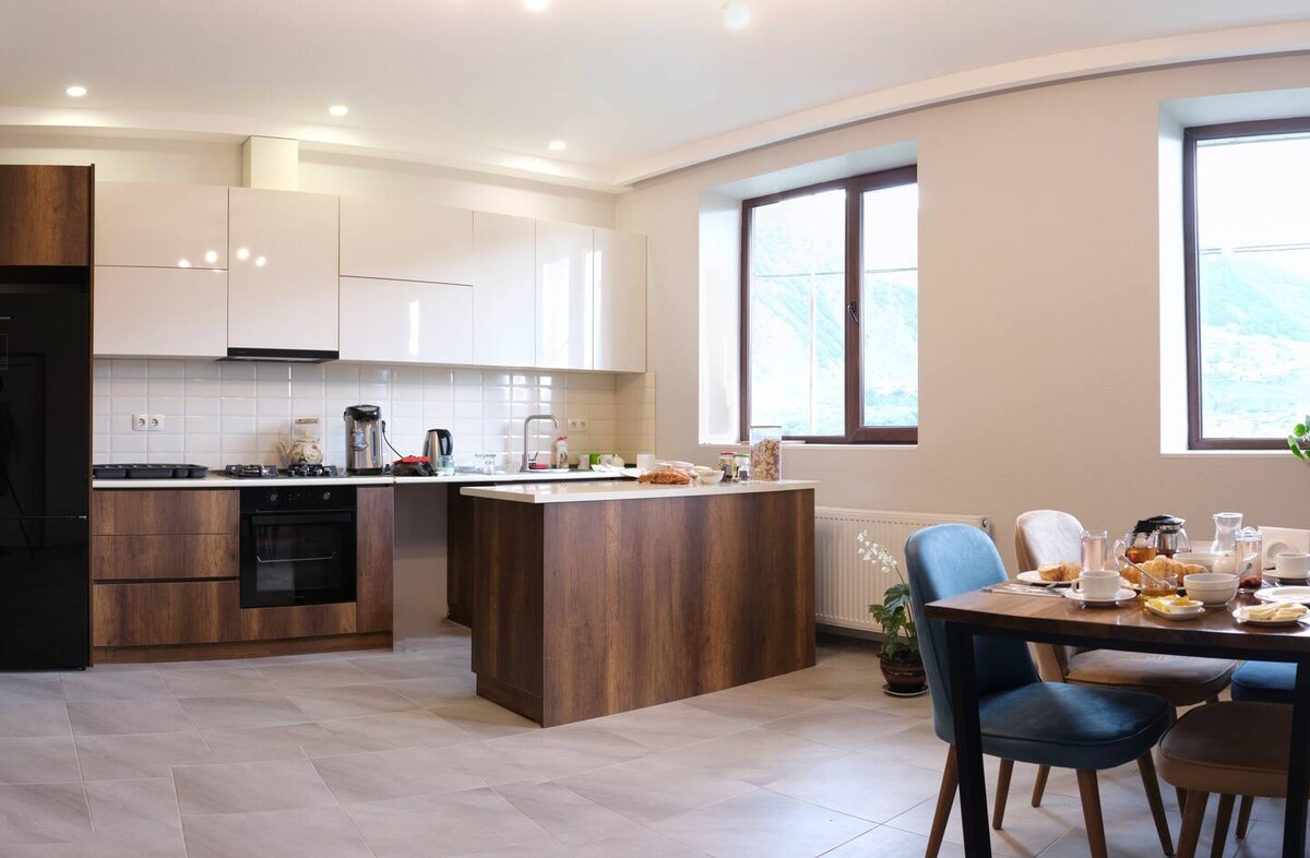 Khatosi es una casa de montaña espaciosa y privada diseñada para familias y grupos que quieren pasar tiempo de calidad juntos en la naturaleza, sin renunciar a la comodidad. Ubicada en el tranquilo pueblo de Komandeli, a pocos pasos de Oni, esta es una de las pocas casas grandes en Upper Racha que puede alojar cómodamente hasta 12 huéspedes, con múltiples espacios interiores y exteriores para relajarse, reunirse y descansar. Desayuno y cena disponibles bajo pedido.