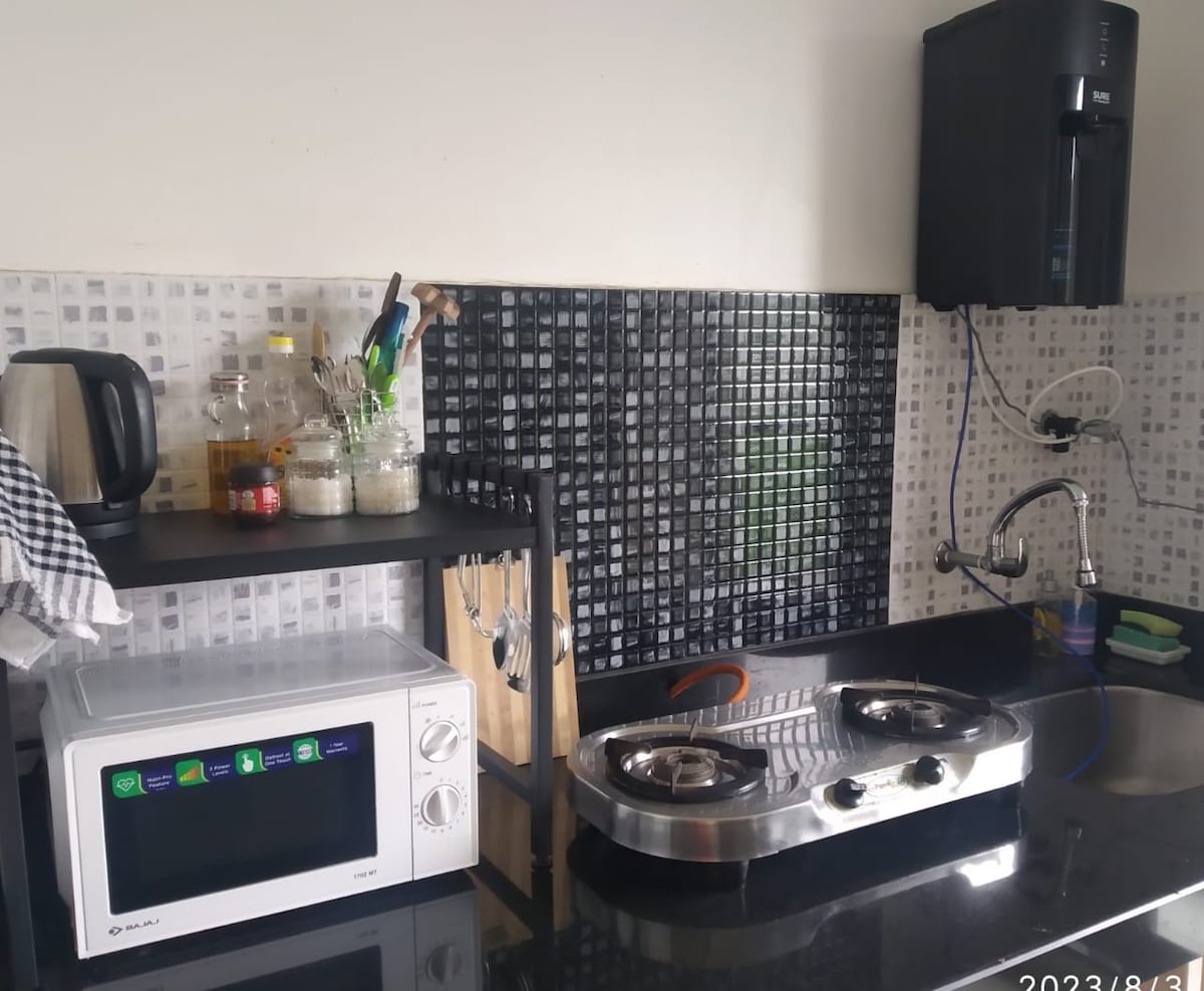 Te damos la bienvenida a un tranquilo y cómodo alojamiento en Karjat rodeado de vegetación y un ambiente tranquilo. Este acogedor departamento de 1BHK en una tranquila sociedad residencial es ideal para parejas y escapadas cortas cerca de Mumbai. El espacio incluye 2 baños, una cocina completa, wifi rápido y una configuración cálida y hogareña. Una abertura junto al jardín trae aire fresco y luz natural. Ubicado justo al lado de DMart para acceder fácilmente a comestibles y artículos esenciales. Estancia sencilla y de buen gusto, ideal para descansar y relajarse