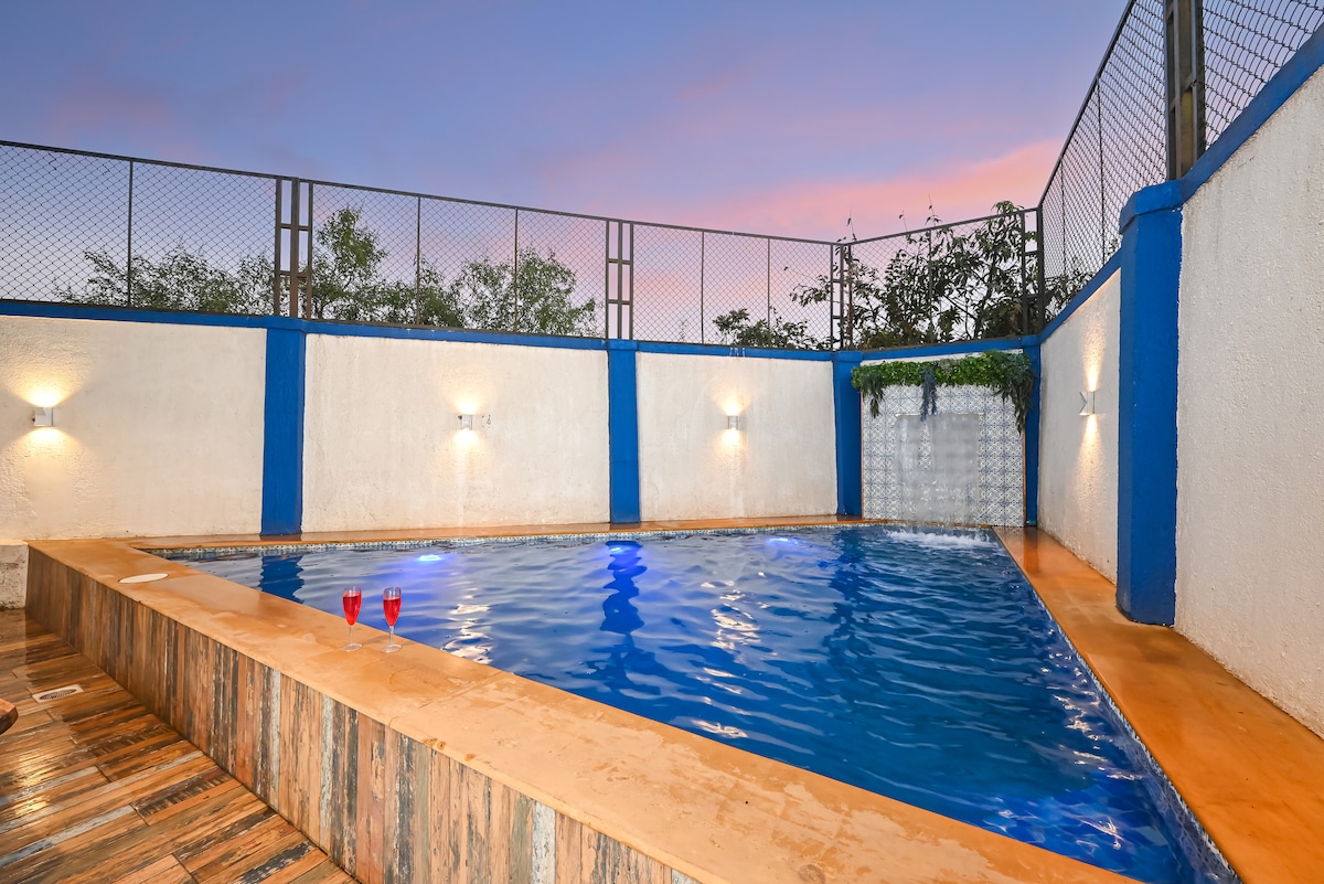 Experimenta un retiro sereno, una pintoresca granja de 3 dormitorios y 4 baños en Nasrapur, Karjat. Este refugio, adornado con exuberante vegetación, cuenta con una piscina, un río que fluye y aparece en Hotelier India. El diseño rústico, hecho con amor, ofrece espacios amplios y abiertos, que invitan a una sensación de libertad y comunión con la naturaleza, un escape ideal para una desintoxicación de la ciudad. Destaca por su compromiso con la sostenibilidad ambiental. Esta villa tiene capacidad para 15 personas durante la noche y 30 personas durante el día, por lo que es ideal para fiestas.