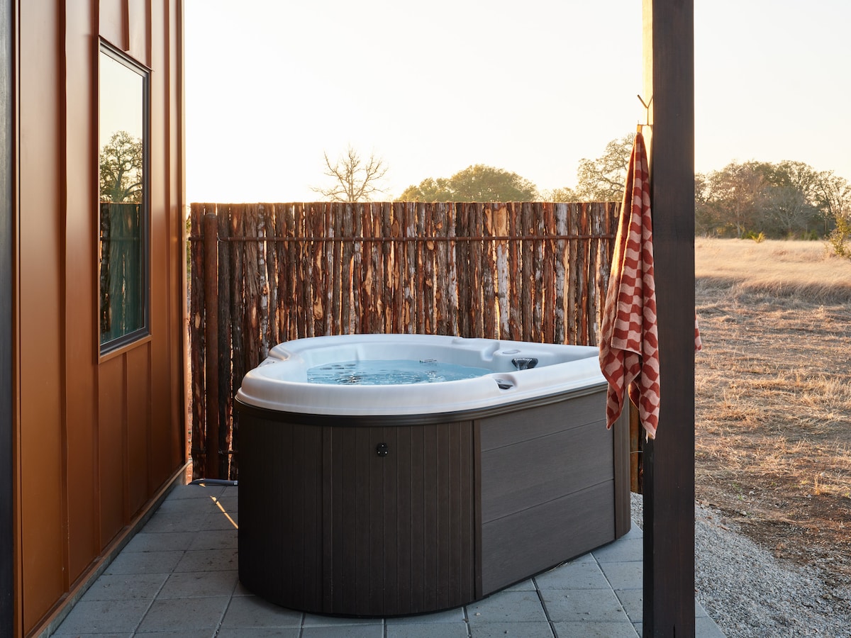 Escápate a una moderna casa del árbol en forma de A a las afueras de Fredericksburg. Ubicada en 17 acres, la cabaña Pecan ofrece vistas a Hill Country, observación de estrellas y avistamientos de ciervos, pero estás a minutos de Main St. Nada en la piscina de contenedores, reúnete en la fogata o simplemente relájate en tu balcón privado. En el interior, disfruta de una cama tamaño king, ducha doble con efecto de lluvia, sábanas de lujo y comodidades modernas. Te espera la combinación perfecta de naturaleza y comodidad.