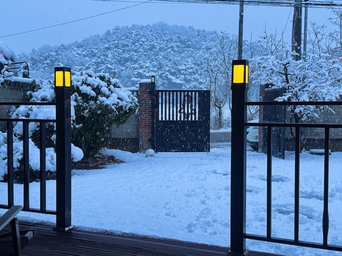 La cima donde se tocan el cielo y la tierra en las cuatro estaciones. Un hanok lleno de aromas de pino y cedrox [Jasanok] Al llegar a la plaza del pueblo de murales, abre la puerta de madera con tejas altas y verás el edificio principal y el Nunmaru. Si pisas el camino redondo y duro, llegarás a la entrada rápidamente. Al entrar en el interior, se puede ver el espacio acogedor con una cama grande y una vista panorámica Una amplia cama tamaño queen, grandes ventanales con vistas y un acogedor espacio con cocina se pueden ver de un vistazo. Al dar la vuelta, se conecta un edificio anexo donde solo se puede disfrutar del spa Jacuzzi. Si sigues el techo pintado de ceniza y cedro Más allá de la ventana y la ventana de doble hoja, se puede ver el centro de la ciudad con la cresta de la montaña. Al abrir la ventana, se convierte en su propio techo abierto. También es bueno pasar un rato en el cálido spa con pies de bambú. Si abres la puerta que se ve entre las salas de té con jarrones de flores, llegas al patio trasero. Se encuentra frente a la plaza y el parque Bomgaebi. Baja y da la vuelta alrededor del muro del edificio principal y vuelve a acostarte. Siéntate y acuéstate en el gran césped. Y ahora disfruta de todo el espacio. @jasannok