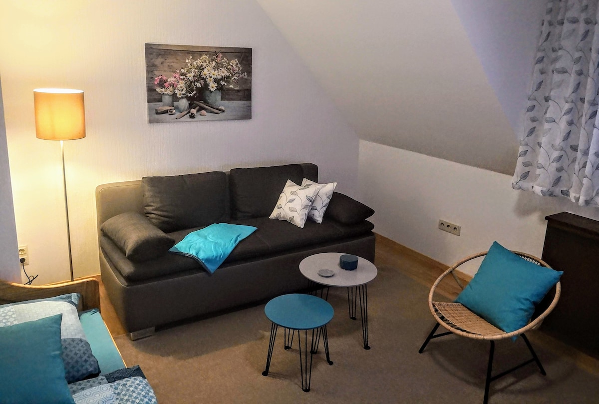 Nuestro nuevo apartamento amueblado y espacioso con entrada independiente tiene una cocina, pasillo, baño, dormitorio con cama doble y una sala de estar con sofá y otra cama individual. Además, el sofá de ducha permanente se puede usar como cama. El moderno baño sigue ofreciendo una ducha. En la cocina encontrarás una estufa con vitrocerámicas de cerámica, así como un horno con convección y un microondas separado. Asientos afuera en el balcón para desayunar o asar.