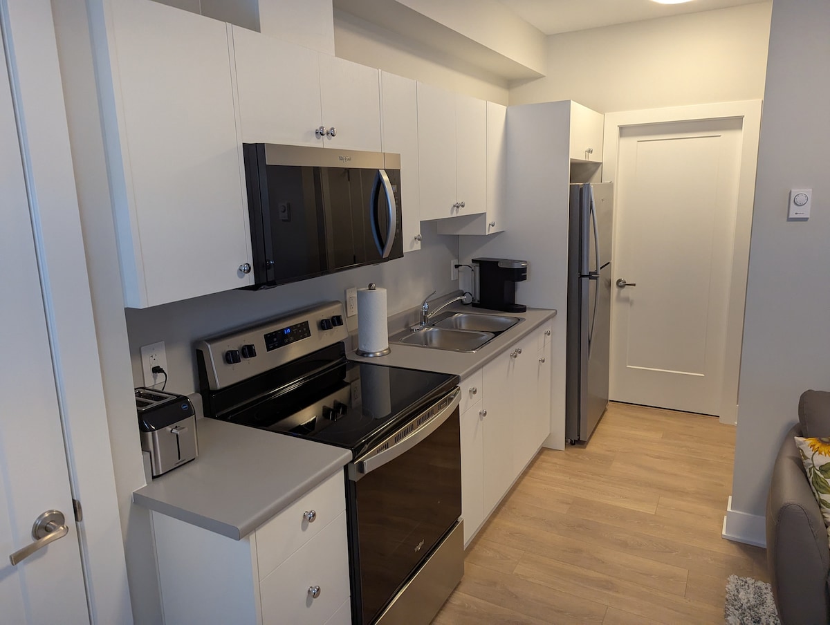 Amplia y elegante suite al final de un tranquilo callejón sin salida junto a un pequeño bosque. Combinación de salón/comedor con rincón de cocina con nevera, cafetera Keurig, microondas, hervidor de agua, tostadora y enfriador de agua. Relájate en el gran y cómodo sofá y en el sofá de dos plazas con una gran televisión de 55 pulgadas. El dormitorio ofrece una cómoda cama tamaño queen y un escritorio. El baño tiene una combinación de bañera y ducha. Se proporcionan toallas, jabón y champú. Te invitamos a compartir nuestro pequeño oasis en el patio trasero y nuestra chimenea de gas.