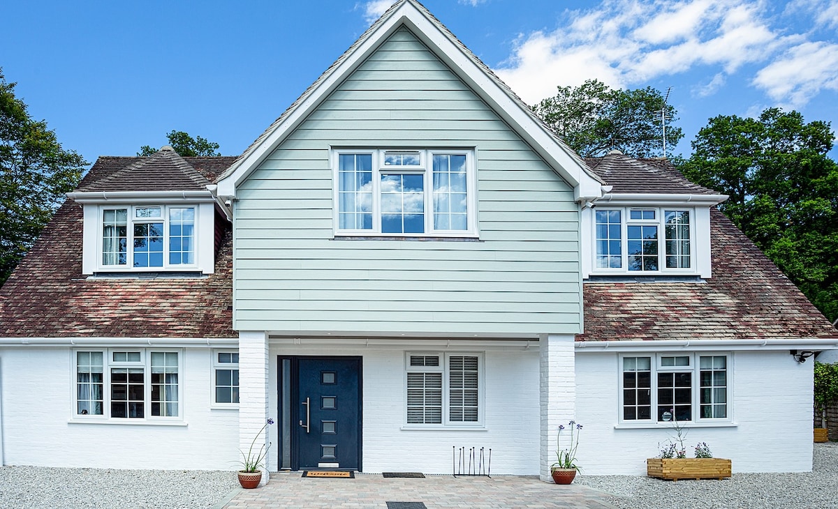 Una casa de campo independiente situada en una posición tranquila rodeada de bosques a 4 millas del centro de la ciudad de Guildford y reformada con un alto nivel con cocina totalmente equipada y un lavadero con lavadora, secadora y aseo en la planta baja. Hay cuatro dormitorios, uno con baño privado y un baño familiar. Estacionamiento para 3 coches. Amplio jardín con patio y asientos y una gran cama elástica con red para su uso bajo su propia responsabilidad. En nuestro hogar todas las personas son bienvenidas, vengan de donde vengan.