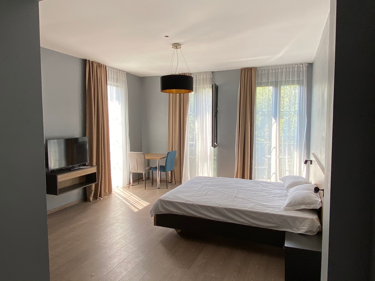 Welcome to Blue Escape – a calm, hotel-style room with balcony and access to a newly built shared drop pool surrounded by nature. Designed in soft blue tones, it’s perfect for solo travelers or couples seeking peace and comfort. Enjoy the fresh air, relax in a cozy bed, and stay connected with Wi-Fi and smart TV. While there’s no kitchen, great cafés are nearby. A quiet retreat just minutes from Batumi’s center.