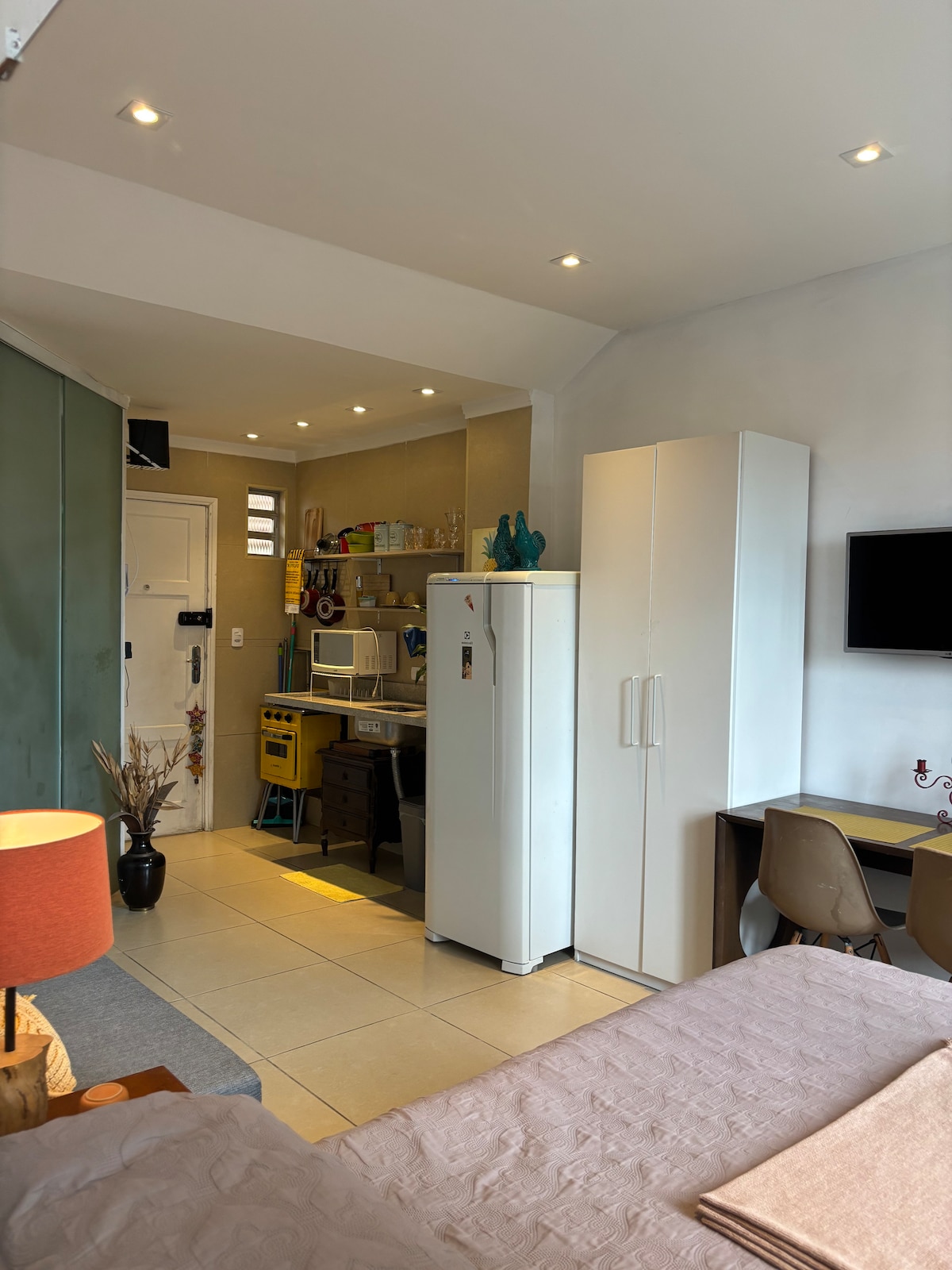 Ubicado en la zona más encantadora del paseo marítimo de Santista, el canal 3 "Playa Joinville" este acogedor loft recién renovado con hermosas vistas está listo para recibirte con comodidad y practicidad. Televisión inteligente con acceso a Netflix y Prime Video, wifi, aire acondicionado y una ducha deliciosa. Para aquellos que quieren pasar un fin de semana o una temporada más larga. La cocina está equipada con refrigerador, estufa, horno de gas, microondas y filtro de agua conectado al grifo.