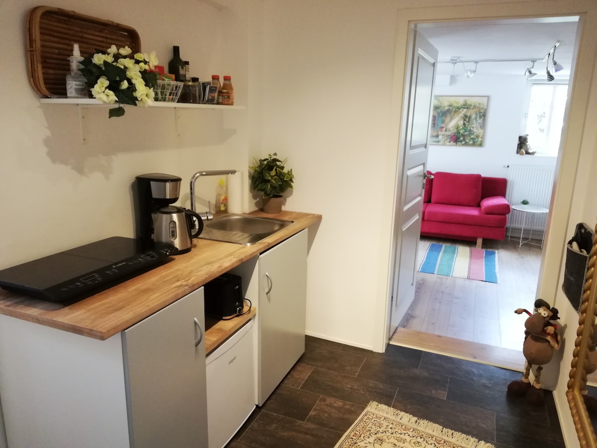 El apartamento semienterrado amueblado con cariño se encuentra en el distrito sur de Gotinga, justo al borde del bosque. El apartamento tiene capacidad para un máximo de 4 personas y cuenta con una gran cocina con zona de estar, baño con ducha y WC. Tiene un dormitorio grande y bonito con zona de estar (cuna si es necesario) y una sala de estar con un moderno sofá cama. Delante de la entrada hay una pequeña y acogedora terraza.