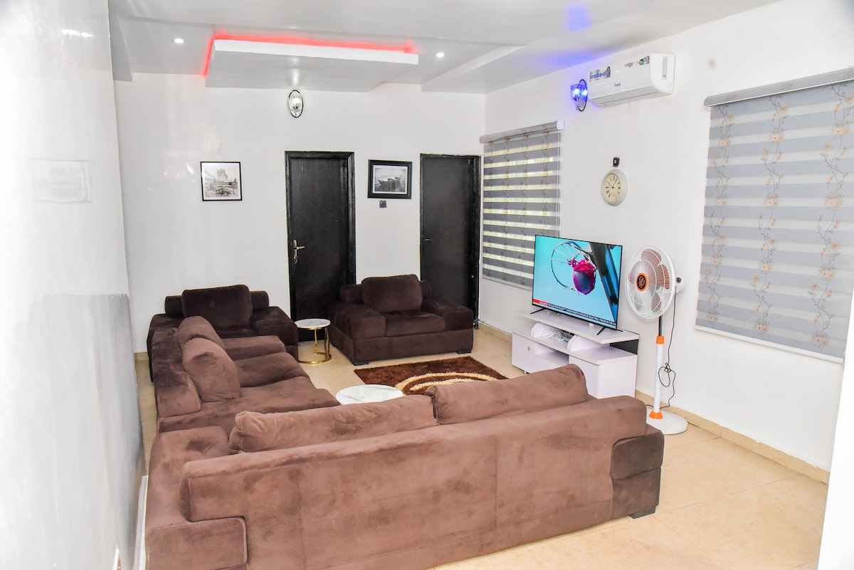 Ubicado en un vibrante vecindario, este moderno departamento de dos dormitorios es tu escapada acogedora y conveniente. Con aire acondicionado con energía solar, este refugio ecológico garantiza comodidad mientras te relajas y exploras. El departamento tiene capacidad para cuatro huéspedes, ofrece una cama tamaño king en un dormitorio y una cama tamaño queen en el otro, lo que proporciona noches de descanso. Disfruta de la comodidad de 2,5 baños, incluidos dos en suites con duchas a ras de suelo, perfectos para refrescarte por las mañanas o relajarte después de un día fuera. Cocina con facilidad utilizando la cocina equipada para delicias culinarias, completa con todos los electrodomésticos necesarios para dar vida a tus comidas favoritas. La sala de estar de diseño abierto te invita a relajarte, con un televisor inteligente y wifi para entretenerte o mantenerte conectado. Se proporcionan sábanas y toallas frescas, lo que se suma a la comodidad de tu estancia, mientras que la comodidad de un jardín comunitario ofrece un espacio compartido para disfrutar. Aprovecha el estacionamiento gratuito en el lugar, asegurando que las preocupaciones de transporte se mantengan a raya. Descubre las atracciones cercanas con facilidad: Aeropuerto de Benín (7 minutos en auto), Museo Nacional de Benín (10 minutos en auto), Palacio de Oba (10 minutos en auto), Calle Igun (10 minutos en auto) y Parque Zoológico y Natural de Ogba (25 minutos en auto). Deja que este departamento sea tu santuario de descanso mientras exploras y disfrutas de la riqueza cultural y la serenidad urbana cercanas.