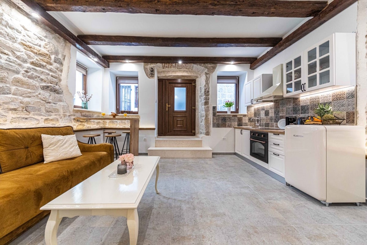 Apartamento único ubicado en el centro de Sucurac. Completamente renovado en 2023. El apartamento tiene las vigas originales y las paredes de piedra que te dan la sensación de vivir en la historia, pero con todas las comodidades modernas que disfrutamos en estos días. Disfruta de tu cena mientras ves el agua justo en la puerta de entrada. Nadar en una de las playas a solo 5 minutos del apartamento. O simplemente siéntate afuera y mira las puestas de sol sobre el agua. ¡Ven a visitarnos!