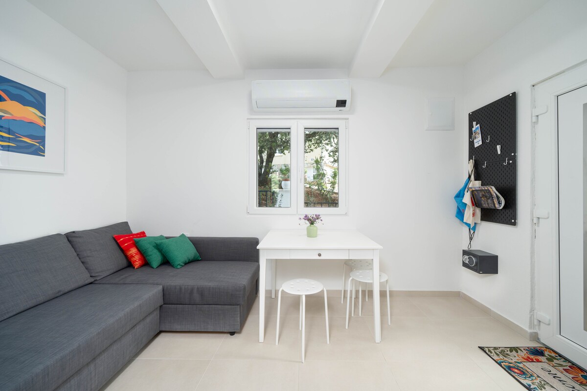 Hermoso apartamento estudio recientemente renovado en primera línea de playa. Perfecto para unas vacaciones lejos del ruido y el bullicio. El apartamento consta de un dormitorio con cama tamaño king (180x200cm) y TV inteligente de 43", aire acondicionado, cocina, baño y una amplia terraza amplia con vistas al mar y a la naturaleza verde. A solo unos pasos, bajando unas escaleras privadas, los huéspedes pueden disfrutar del sol, el mar y la sombra bajo los olivos y los pinos. Se proporcionan tumbonas privadas y una ducha al aire libre para los huéspedes.