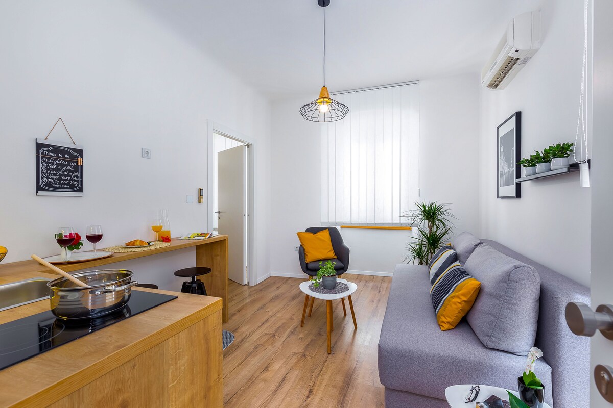 Este moderno apartamento incluye una cocina completa (comedor), un dormitorio combinado y una sala de estar con un cómodo sofá cama y un baño recientemente renovado. El apartamento está situado en el primer piso y en el centro histórico de la ciudad. Es ideal para parejas, especialmente si llegan en autobús, ya que está a un minuto a pie de la estación central de autobuses. El apartamento está muy bien equipado. El lavavajillas y la lavadora secadora se encuentran en la cocina y la televisión en la sala de estar con aire acondicionado.