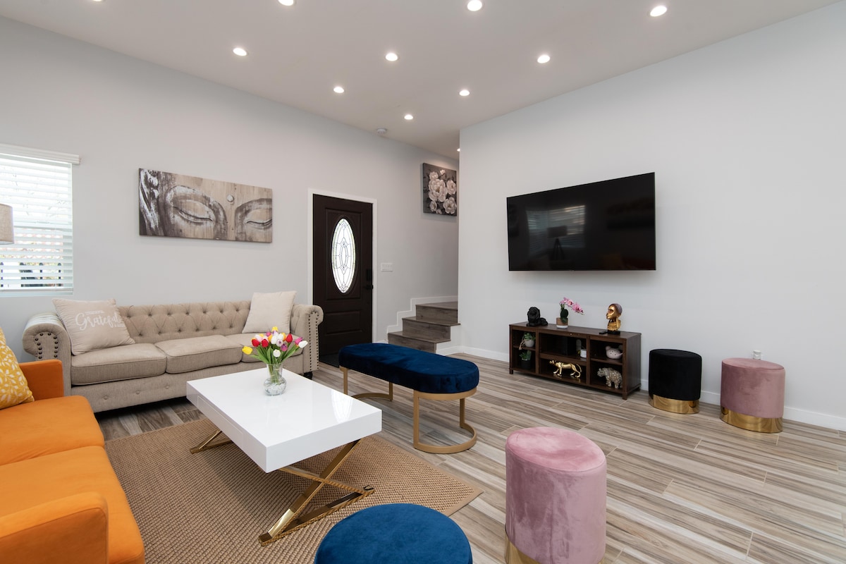 Casa grande y espaciosa (2000 pies cuadrados) de 2 pisos, moderna y luminosa. Recién remodelada con cerradura con teclado, dormitorio principal con cama tamaño king, 2 camas tamaño queen, 1 litera, 2 baños con bañera, mesa de comedor formal, cocina completa, aire acondicionado/calefacción central, lavadora/secadora, televisores inteligentes de alta definición en cada habitación con Netflix gratuito, aplicaciones y wifi. ¡Asientos al aire libre, barbacoa, chimenea y mucho más! Cerca de tiendas, restaurantes, centros comerciales, CSUN y las principales autopistas. A poca distancia en coche de Hollywood, parques de atracciones y playas. Se admiten perros por una tarifa por mascotas.