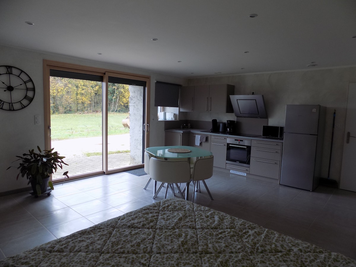 Si desea tranquilidad y vegetación, le ofrecemos un estudio con cocina equipada, lavavajillas, horno, microondas, placa eléctrica, nevera, cafetera, tetera, Senséo, una cama de 180 x 200, TV, gran ducha a ras de suelo con rincón de inodoro. Tenemos internet (wifi) no ilimitado por favor no descargue, sin embargo, en el estudio como en nuestra casa la red móvil es débil.