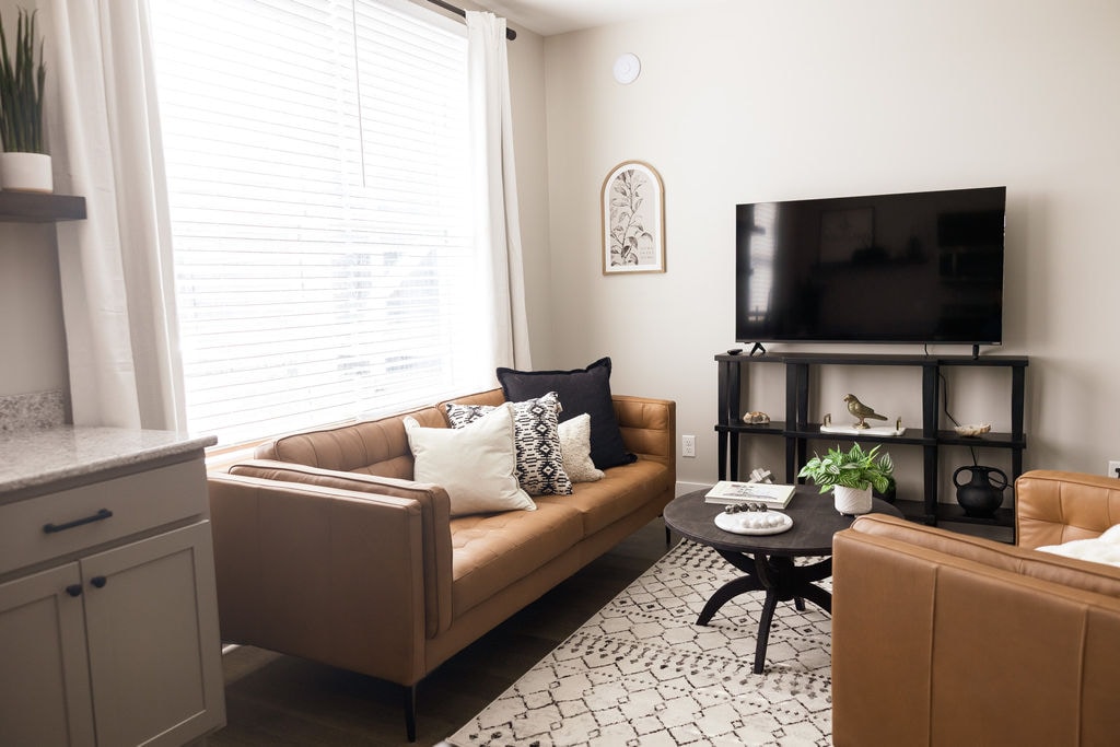Welcome to our cozy 1-bedroom apartment located in the beautiful Northern Kentucky RV Park in Dry Ridge, Kentucky. This short-term rental offers a comfortable and convenient stay for individuals or couples seeking a relaxing getaway. As you enter the apartment, you'll be greeted by a warm and inviting living space that has been tastefully decorated with modern furnishings. The living room provides a comfortable sofa, perfect for unwinding after a long day of exploring the surrounding area.