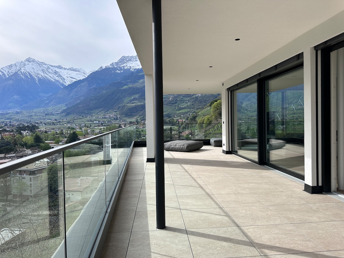 Ein gigantischer Ausblick, eine private Terrasse und zwei neue und stilvolle Apartments. Wo einst eine große Wiese mit Farnen war, steht nun unser "farnhaus", inmitten der Natur, ruhig gelegen und dennoch schnell und einfach zu erreichen. Vor uns erstreckt sich das gesamte Etschtal, ein Spektakel zu jeder Tages- und Nachtzeit und Meran und das Schloss Tirol liegen uns zu Füßen. Ein perfekter Ausgangsort für Wanderungen und schöne Spaziergänge.