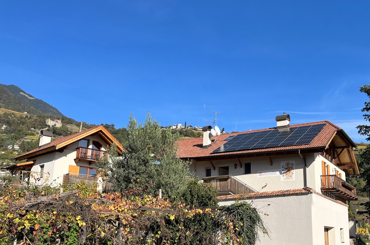 Spannen Sie aus in unserer Ruheoase inmitten von Obstwiesen und Weinbergen, fernab vom Verkehr und trotzdem zentral. Alles Wichtige zu Fuß erreichbar. Rilassati e ricaricati in quest'oasi di quiete ed eleganza in mezzo a vignetti lontano dalla frenesia di questi tempi. Negozi, Ristoranti raggiungibili a piedi. Calm down in our hideaway situated in the middle of vineyards with a breathtaking view on the Adige Valley and the surrounding mountains. All necessary facilities in walking distance.
