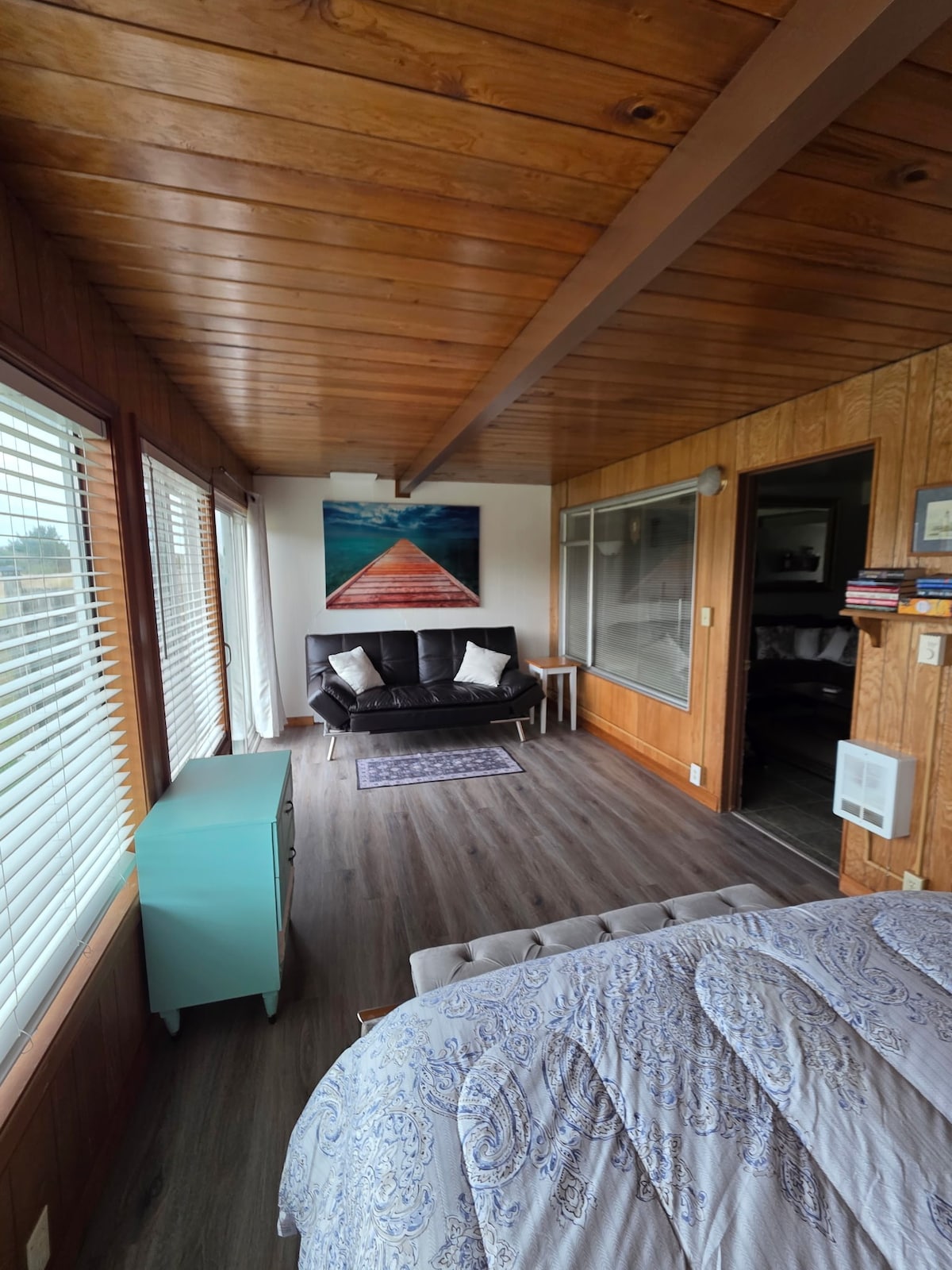 Ven y disfruta de nuestro tranquilo y céntrico lugar de relajación en Ocean Shores, WA. Disfruta del sonido de las olas del mar en la terraza privada con vistas al mar de temporada (invierno). Este dormitorio (cama queen), un baño completo más un sofá cama tiene capacidad para 4 personas cómodamente. Cocina completa bien equipada, comedor y sala de estar con cómodos asientos y gran televisor inteligente con cable. ¡A pocos pasos de la playa o acceso en coche a la vuelta de la esquina! ¡Nos encantaría que te quedaras con nosotros!
