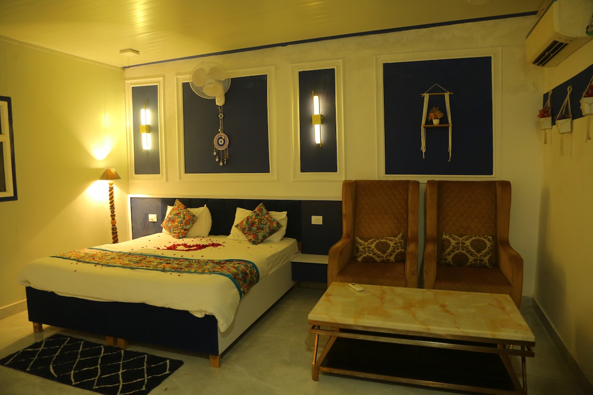 Un estudio totalmente amueblado, elegante y lujoso con una hermosa vista a un paisaje verde y pintoresco durante el día y las luces de la ciudad por la noche. El lugar perfecto para relajarse y desconectar para viajeros de negocios, estudiantes o parejas. Internet de alta velocidad disponible y compatible con el trabajo a distancia. Hay aparcamiento gratuito y seguro disponible en las instalaciones. Estamos ubicados a 5 minutos en coche de Expo Mart, a 8 minutos de Pari Chowk y del centro vacacional Jaypee. Hay comida casera disponible.