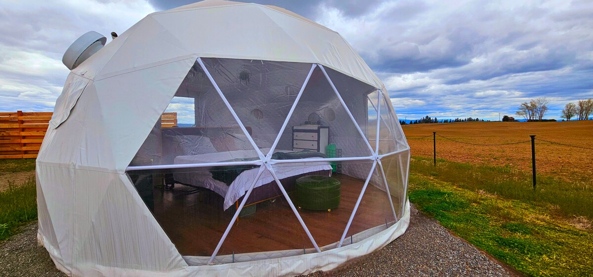 Enjoy a stay in the 16ft dome with exquisite views of Mt. Spokane and coveted Green Bluff scenery. Superb sunrise/sunset observing. Accommodations include a comfy king bed, wifi, bedding, outdoor shower, porta-potty, hand wash station, coffee and hot tea station, solar powered battery pack for charging devices, games, yoga mat, etc. Partake of all the local farms, wineries, breweries, and farm activities around you! Close to all local wedding venues. Sorry no pets or children under 12.