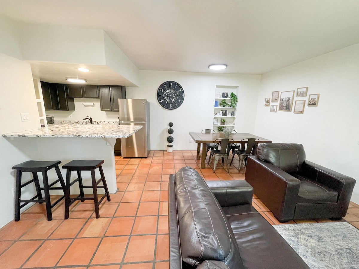 Amplia casita cerca de Ventana Canyon que cuenta con dos dormitorios, planta baja sin unidad encima, encimeras de granito, wifi, Directv con paquete Premier (el dormitorio principal y la sala de estar tienen cable), un patio privado con parrilla y una plaza de aparcamiento cubierta. Para estancias largas (más de un mes), ¡envíame un mensaje y podemos negociar las tarifas! La unidad está equipada con: - Sistema de ósmosis inversa - Televisor inteligente 4K - Cafetera - Horno tostador - Licuadora - Cocina totalmente equipada con utensilios de cocina.