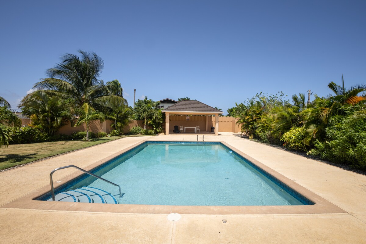 Alojamiento de lujo moderno con ubicación céntrica y concepto abierto, con decoración moderna. 8 camas| 2,5 baños, sala de estar, comedor, cocina bien equipada, piscina reluciente con glorieta, juegos, mesa de billar. Amplio dormitorio principal con mesitas de noche y cómoda, además de un baño privado tipo spa. Gran patio cerrado. Segundo dormitorio con cama tamaño queen, sofá cama con ruedas, TV, mesita de noche, tercer dormitorio con cama doble y litera, mesita de noche y vestidor. Segundo baño con ducha de lluvia. A 5 minutos de Pearly Beach, Laughing Waters, Dunn's River Falls, Mystic Mountain, Dolphin Cove, 1212L