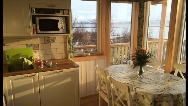 Número de registro:- HG-00020047. La cabaña tiene 15 m2 y es una pepita oculta en nuestro jardín con vistas al fiordo frente a Akureyri. La cabaña se completó en abril de 2020. Hay una pequeña cocina con hervidor de agua, microondas y nevera. El WC está separado en el interior con un lavabo de mano. La cabaña es privada y hay una terraza de media envoltura para disfrutar de las vistas de la noche y los cielos de medianoche. Hay una ducha exterior con agua caliente para una experiencia natural. Todos los productos de la cabaña están libres de fragancias.