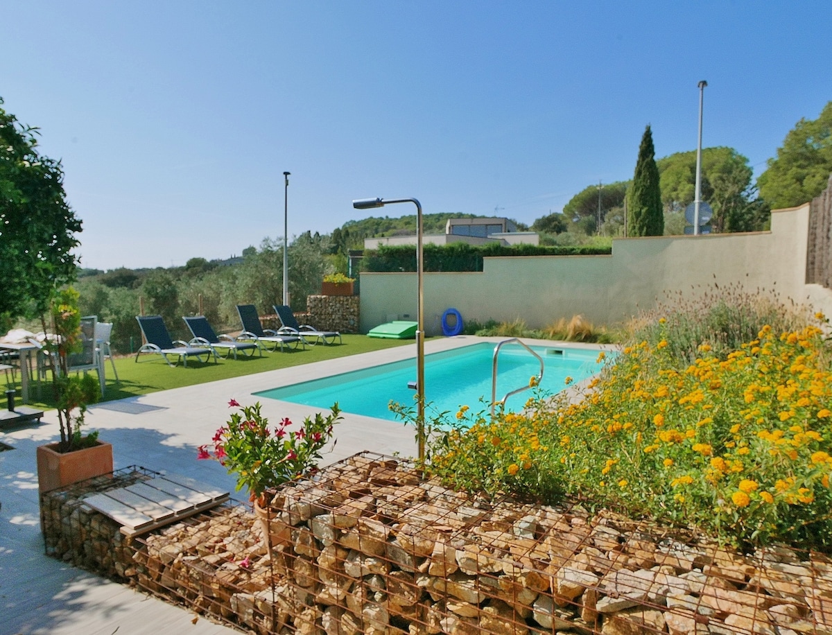 Espectacular villa nueva (2020) de 225m con gran jardín de 2000m y piscina, en el bonito pueblo medieval de Llofriu. Muy luminosa. Grandes cristaleras con vistas al campo.Las habitaciones tienen salida independiente al jardín. Gran porche cubierto con mesa y vistas maravillosas para relajarse. Casa muy bien situada para visitar la zona playas, rutas en bicicleta etc Ideal para familias/parejasChimenea con cristal para estar a gusto leyendo en el sofa o disfrutando de las vistas en època de frio