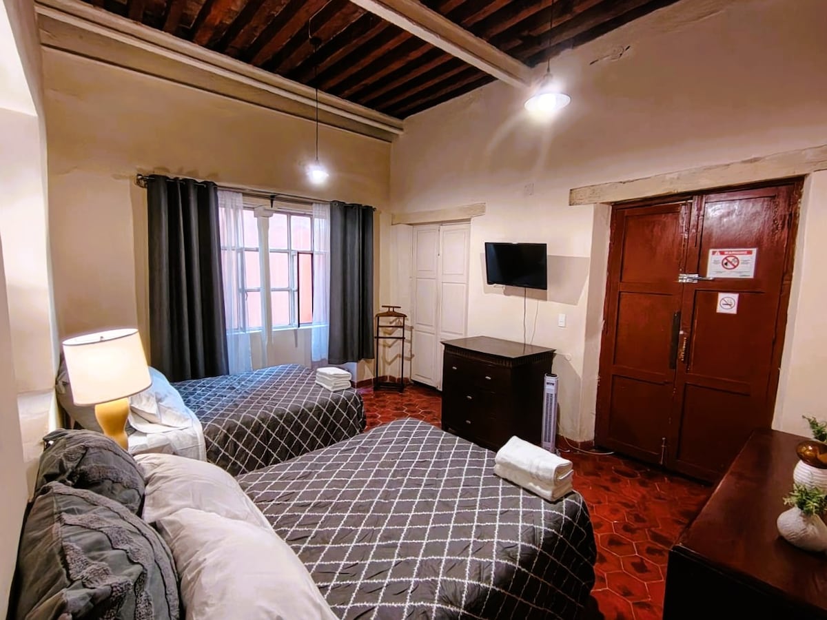 🏡 Hospédate en una casona colonial del Siglo XVIII en el corazón del Centro Histórico de Guanajuato. 🎭 Esta suite fue testigo del nacimiento del Festival Cervantino, donde los artistas se preparaban para los Entremeses Cervantinos. ✨ Combina comodidad moderna, Wi-Fi y baño privado, con la magia histórica y cultural de la ciudad a tus pies, sobre la calle Positos.