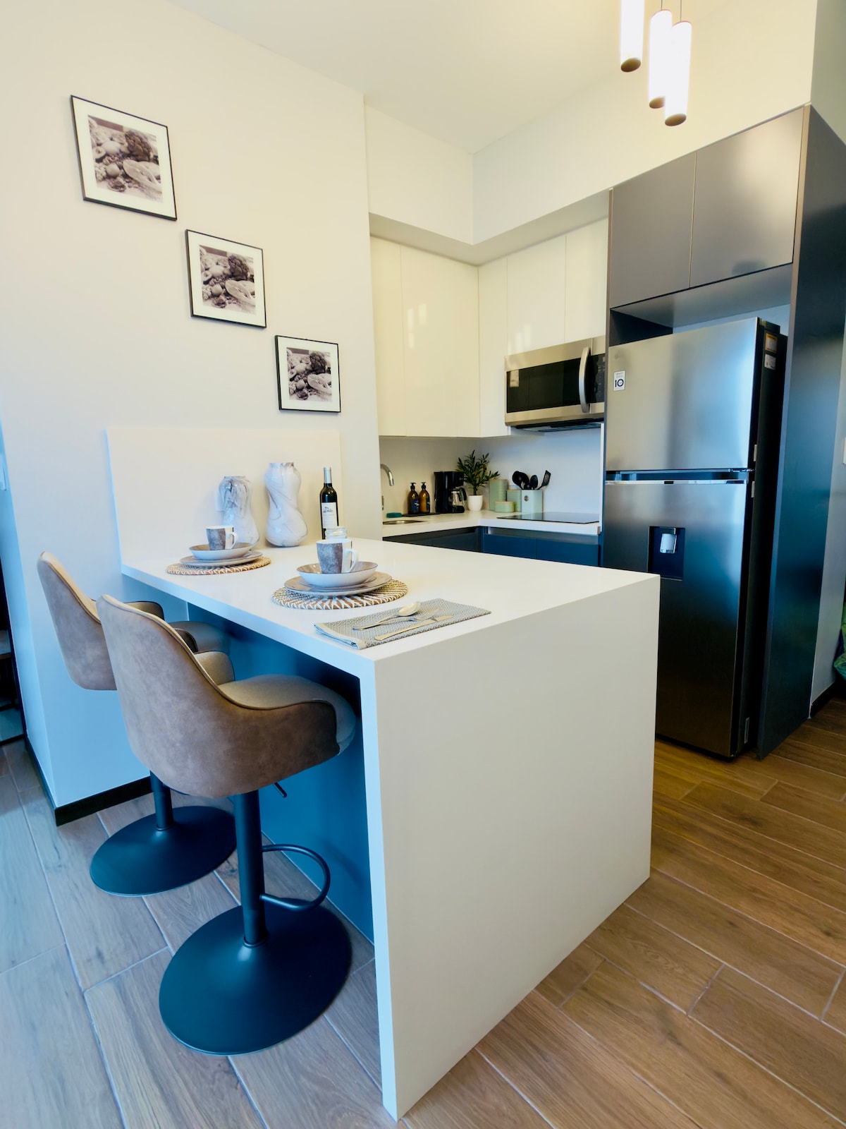 moderno, minimalista, práctico. A 8 minutos de los principales centros comerciales y restaurantes de lujo, a 15 minutos del aeropuerto internacional. Cocina totalmente equipada. WiFi, TV por cable de alta definición, Spotify, Netflix. Lavandería con lavadora y secadora