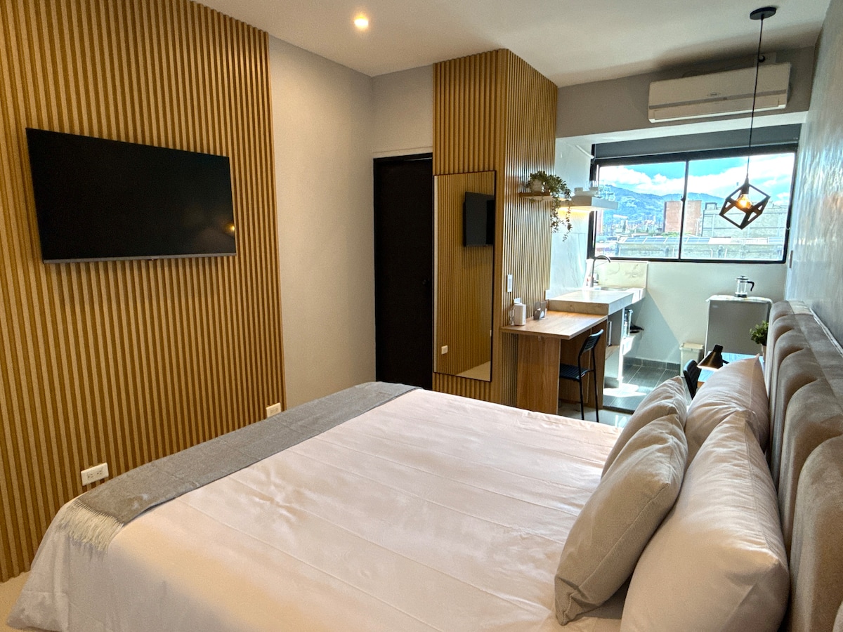 Suite completamente amoblada de 28 m2, con aire acondicionado y cocineta. Ubicada en una de las mejores zonas de Medellín, en un barrio muy tranquilo y cerca de todos los sitos de interés. La Suite cuenta con una vista espectacular a la ciudad y a las montañas. Podrás hacer uso de la zona de coworking, gimnasio y un espectacular café que ofrece diferentes tipos de bebidas a base del mejor café colombiano, podrás disfrutar de tu bebida en la terraza que se encuentran en el 2do piso del edificio.