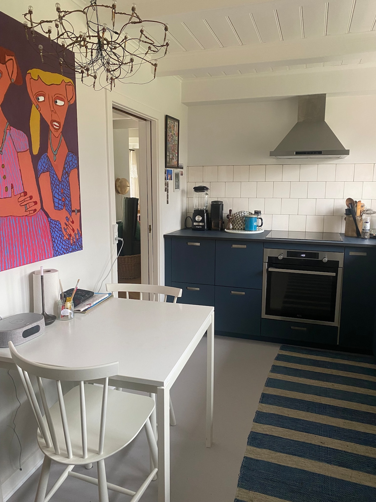 Hay muy pocas casas de verano reales en Gudhjem. Aquí hay una, única, tanto en estilo como en ubicación. El ambiente nórdico/bohemio está completamente implementado en toda la casa. Todo, desde el dormitorio con la pintoresca vista de arriba hasta la cocina/sala de estar con la chimenea y la puerta francesa que conduce al romántico patio pequeño dividido en pequeños patios en diferentes niveles, hasta la zona de estar con parrilla de gas entre clematis en la cerca de piedra circundante, ¡grita hygge!