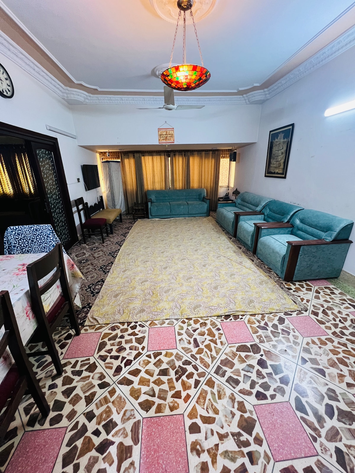 Es una unidad completa independiente y luminosa con una decoración moderna, 3 dormitorios con baños adjuntos, un amplio salón, una cocina totalmente equipada y una azotea. Las 3 habitaciones tienen aire acondicionado con muebles cómodos para ayudar a crear el ambiente para una estancia perfectamente relajante. La ubicación del edificio lo hace ideal para familias o grupos grandes, con capacidad para 6-7 adultos y niños. A 15 minutos en coche del AEROPUERTO, Lucky One Mall y Dolmen Mall Tariq Road. También a 7 minutos en coche de la calle de comida (Maskan).