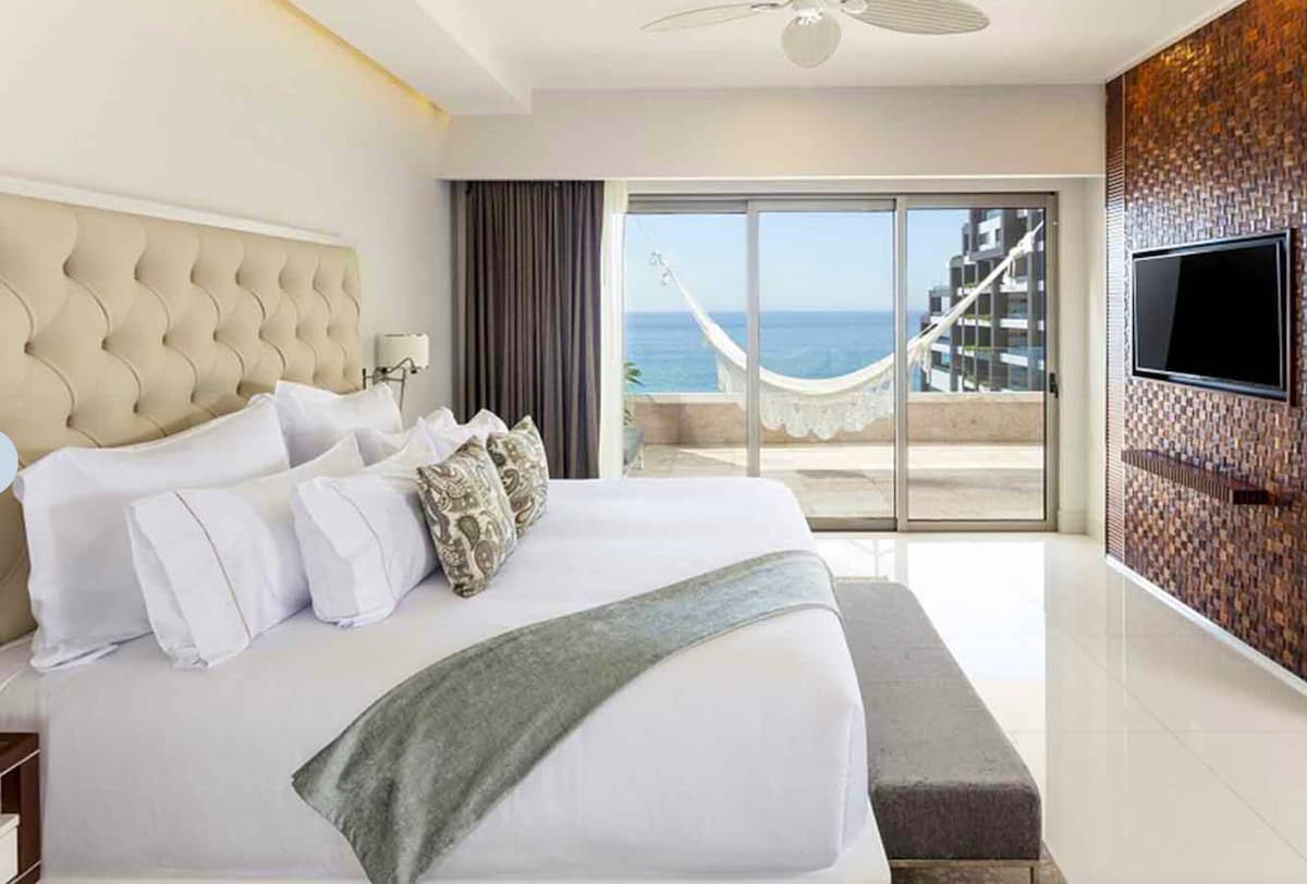 Lujosa y espaciosa suite de 667 pies cuadrados en un centro vacacional de 5 estrellas: - 1 cama tamaño king (para 2 huéspedes) o 2 camas tamaño queen con líneas finas. - Balcón privado con asiento de amor, mesa de centro y hamaca. - Baño inspirado en el spa con ducha de efecto lluvia. - TV de pantalla plana de 49 pulgadas, bar totalmente equipado Acceso a las instalaciones del centro vacacional: - Acceso a la piscina, incluida la azotea solo para adultos. - Playa con unbrella y sillas de playa - Gimnasio - Cena gourmet en restaurantes de clase mundial (opcional todo incluido o paga a medida que avanzas) - spa de lujo (con cargos)