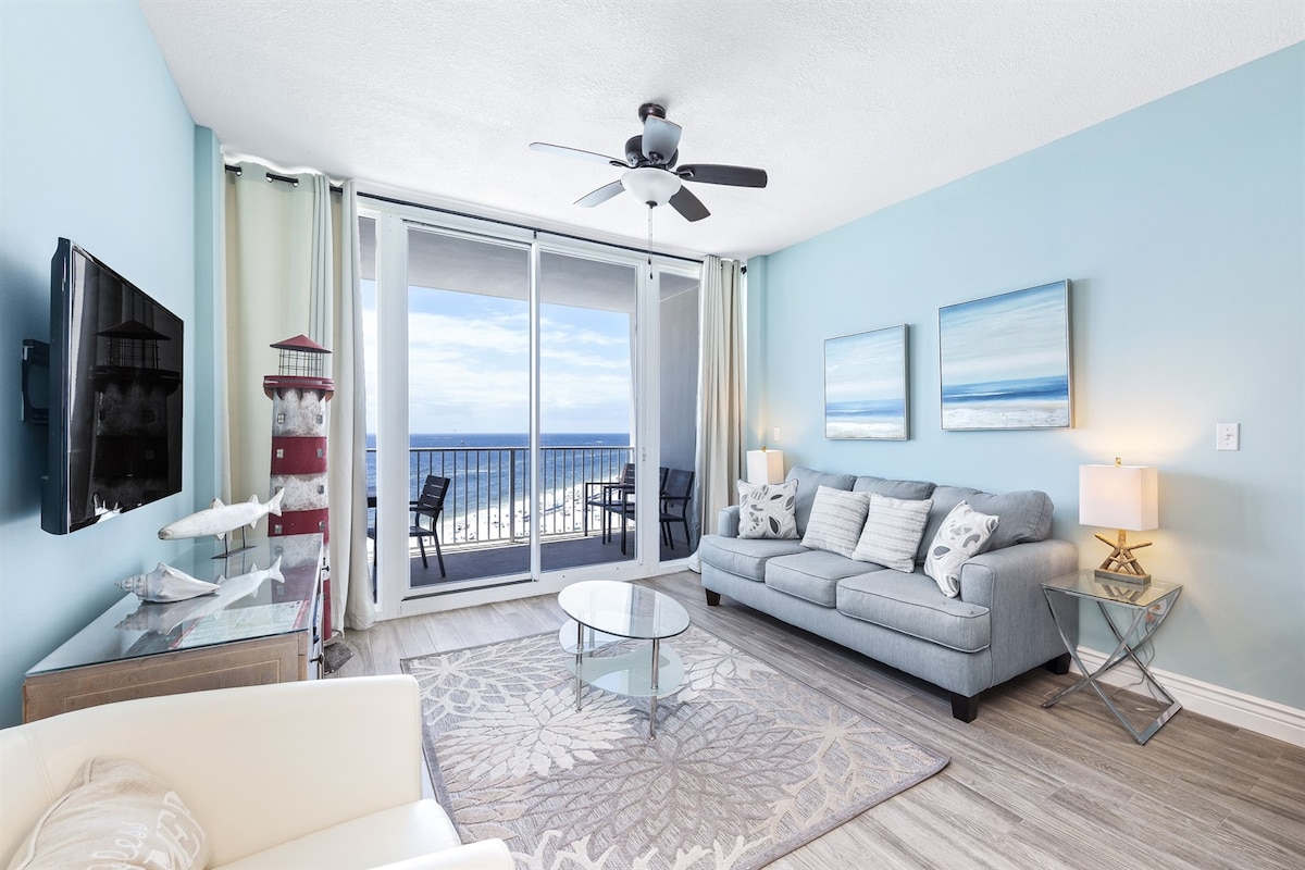 Quinto piso, frente a la PLAYA *¡Totalmente actualizado para tu estancia en 2025! * Frente al golfo: 2 camas tamaño king, cómodo sofá cama, 2 baños completos. * Disfruta de un café en el balcón viendo delfines en el Golfo. * Cocina totalmente equipada con especias, K-Cups, té, chocolate caliente. * Pasos a la playa a través del acceso con llavero. * Piscina interior/exterior, bañera de hidromasaje, sauna y gimnasio. * Estacionamiento cubierto y wifi gratuito. * A 15 minutos a pie de The Hangout. * Televisores inteligentes para streaming. * Un pase de estacionamiento GRATIS, segundo pase de estacionamiento: $45. ¡RESERVA HOY MISMO! ¡Estamos ansiosos por DARTE LA BIENVENIDA!