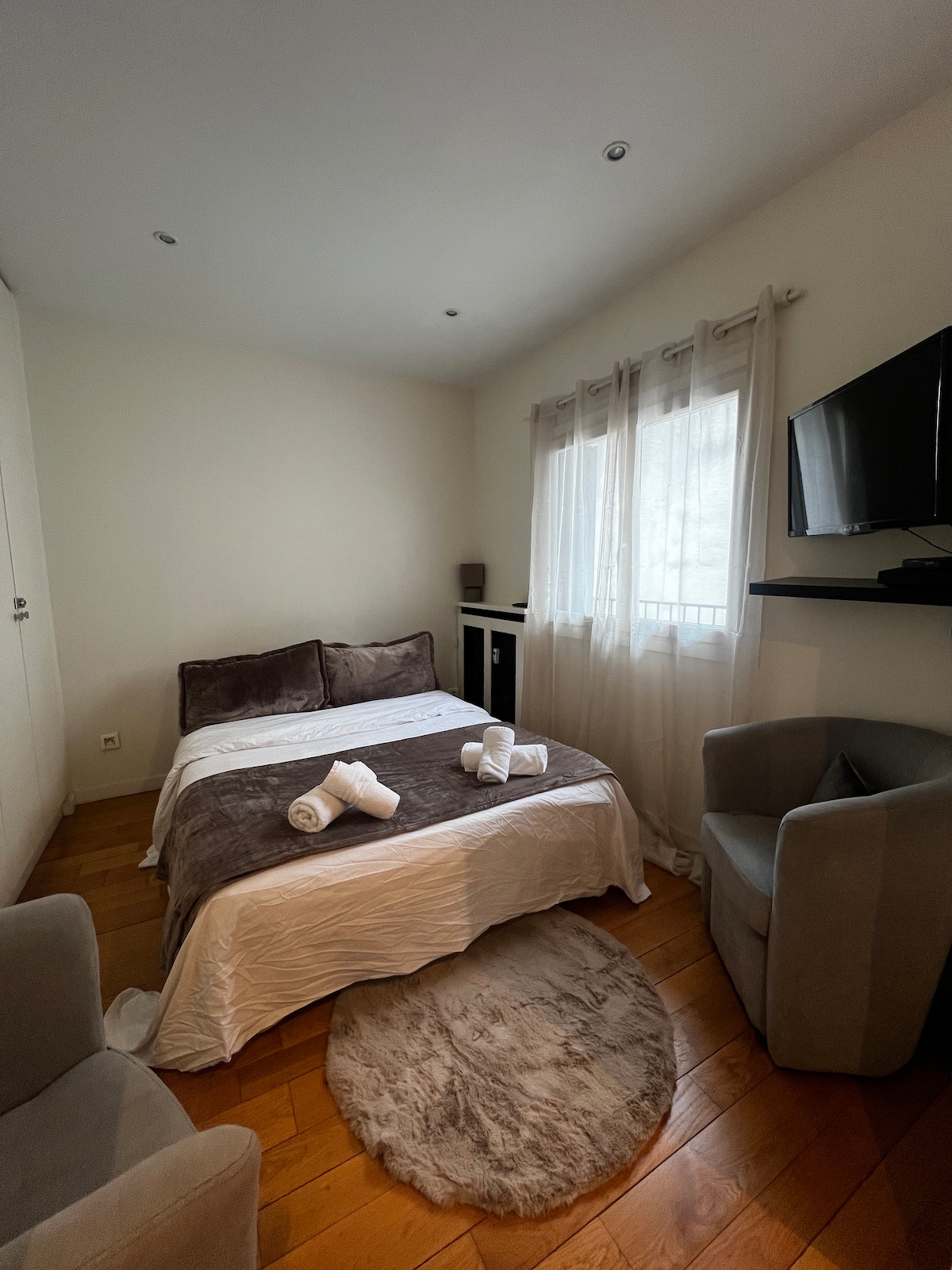 Impresionante estudio con baño privado, reformado, para 2 personas El alojamiento independiente en una calle muy tranquila está a 2 minutos del tranvía T1 VILLAGE y del metro 13, así como de muchas tiendas. Aparcamiento gratuito en el barrio(se requiere disco) Cocina equipada. Sofá cama 160/200 (2 colchones de 1 persona) (cama nido) Wifi, televisión por internet Pequeña terraza privada. Entrada exterior común . Cerca de lugares de interés: Montmartre, Campos Elíseos, Torre Eiffel, Estadio de Francia