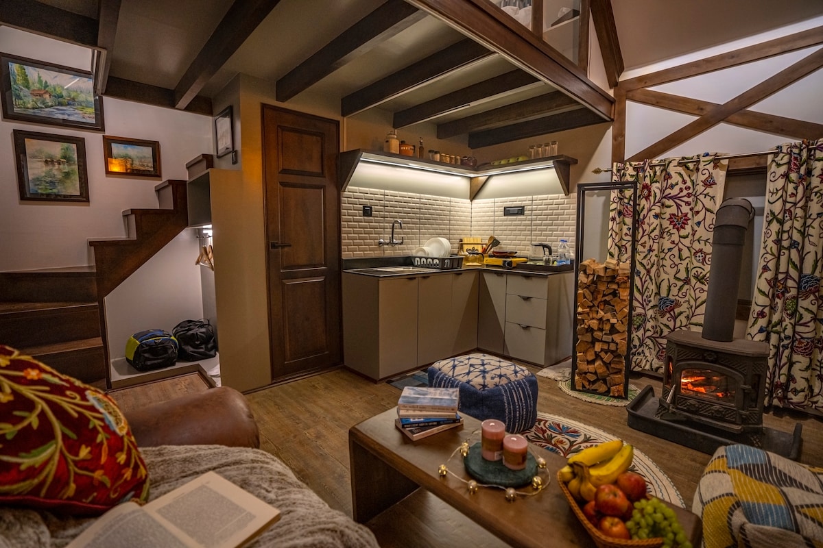 Hushstay x Olive Chalet, a 2-bedroom chalet in Tangmarg, blends snug luxury with natural charm. Nestled 40 km from Srinagar, it offers a haven amid wildflowers and a gentle stream. The A-frame cabin with skylights and vibrant decor invites nature's embrace. Ideal for couples or smaller groups, it is part of a private estate alongside Hushstay x Cheese Cottage. The retreat promises a sanctuary where each day unfolds with nature's murmurs and concludes under a starry symphony.