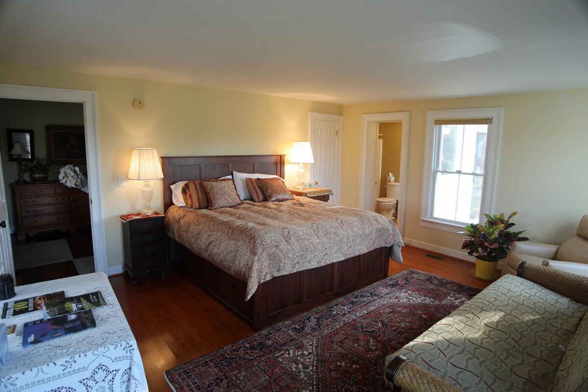 La suite Chesapeake cuenta con una encantadora cama antigua con dosel de cerezos. La suite cuenta con el dormitorio, así como un pequeño rincón de lectura adjunto y un baño privado separado con una bañera con patas y una combinación de ducha. El desayuno está incluido en el precio de la habitación. Los huéspedes disfrutarán un desayuno completo en el campo. Nuestras áreas comunes están abiertas para que todos nuestros huéspedes disfruten. El porche del segundo piso con vistas al patio trasero y más allá siempre es popular. Puedes sentarte y disfrutar de las brisas frescas.
