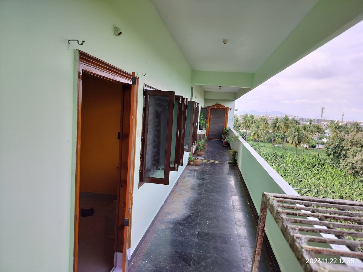 Looking for an affordable stay in Vijayawada? Our spacious villa offers two cozy bedrooms with attached bathroom, a fully equipped kitchen, a comfortable living room, AC, a laptop-friendly workspace, breakfast included, and is conveniently located near the airport. Perfect for a relaxing getaway without breaking the bank!