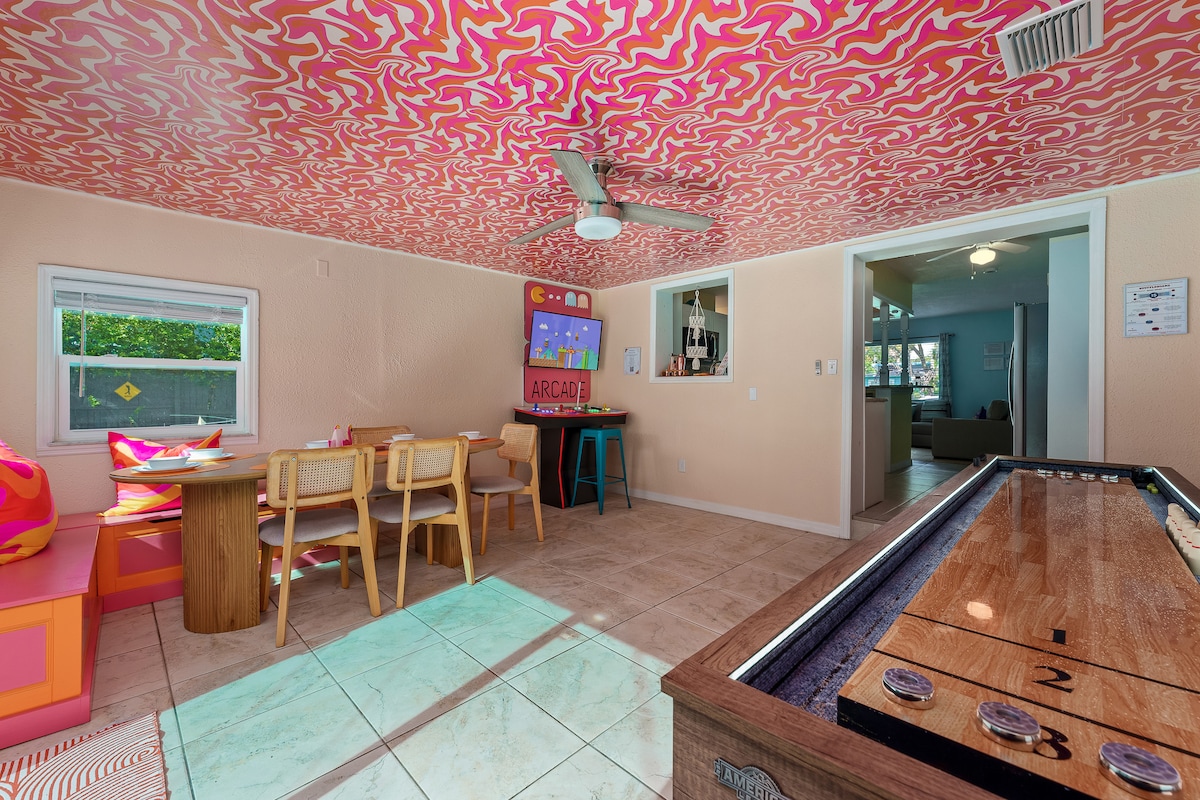 Welcome to Clearwater Hangout- This super unique house was designed to be packed with many amenities. Just 4mi to famous Clearwater Beach! Newly renovated with fresh tiles and quartz counters for a high end trendy design. Inside amenities include- LED vanity, pool tbl/ping pong, wine fridge, dining for 14, and a full transformed game room with a basketball court, Pac-man machine, and a home theatre! Outside is a very private clean space with mini golf, a salt water pool, seating area and firepit