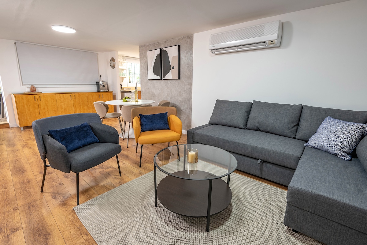 Alójate en mi lujosa casa de 3 dormitorios en un tranquilo pueblo en el centro de Israel, con un techo de 6 metros de altura y una mezcla única de arte pop de lujo y decoración vintage. Disfruta de las vistas al amanecer desde el dormitorio principal y la puesta de sol desde la terraza panorámica con jacuzzi y ducha exterior. Incluye una cocina totalmente equipada, una habitación para niños con literas, una habitación segura (mamad) con áreas de trabajo y juegos, wifi rápido, Netflix, lavadora y secadora. ¡Perfecto para personas que buscan comodidad y estilo!