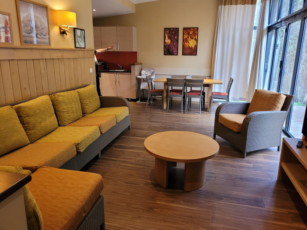 acceso a Aquamondo y actividades adicionales. Cabaña 214 PMR 6 personas más equipamiento de bebé, 3 baños ( 1 bañera de hidromasaje , 1 ducha de chorro , sauna para 2 personas ), 2 aseos, salón con chimenea, tv salón y 2 dormitorios . cocina equipada ( lavavajillas y horno microondas),airfryer( finales de marzo) , 2 cafeteras de filtro y hervidor de agua dolce gusto tostadora. terraza muebles de jardín y tumbonas. cerca del espacio kids/minigranja y la cúpula ( 10 min a pie). limpieza durante la estancia con suplemento bajo petición
