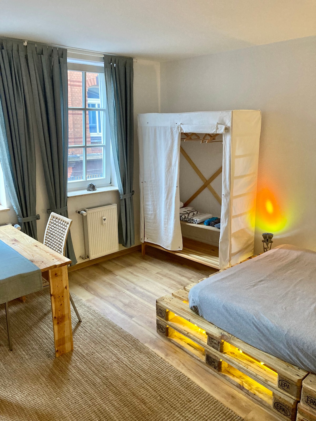 La habitación está en el sótano de una villa en una buena ubicación de Weimar. Tiene una entrada independiente en el lateral de la villa, donde también hay una pequeña zona de estar al aire libre con mesa para los huéspedes. Allí se bajan un par de escaleras hasta la entrada. En el vestíbulo está el armario, donde también hay una nevera, un hervidor de agua y una cafetera Nespresso. Desde allí se accede al aseo. El dormitorio tiene una cama de 1,40x2 m con zona de estar y un pequeño baño con ducha a ras de suelo. ¡No hay cocina!