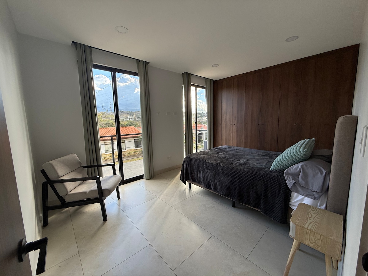 Pick up at the airport (on schedule) by small fee, 2 unts more, cars for rent, airport stay 2km, ideal to rest before after long trip, new studio with kitchen, 1 bedroon, AC, priv bathroom, safe, TV Netflix, hot water, fully equipped, terrace BBQ, 2min to foot of semi-private paid club with pools of pure and cold spring water, close to airport, car rentals, restaurants, shopping, train and bus stop, easy access to the roads that go to Sjo or the Pacific, 30min from Poas Volcano, Starbucks farm
