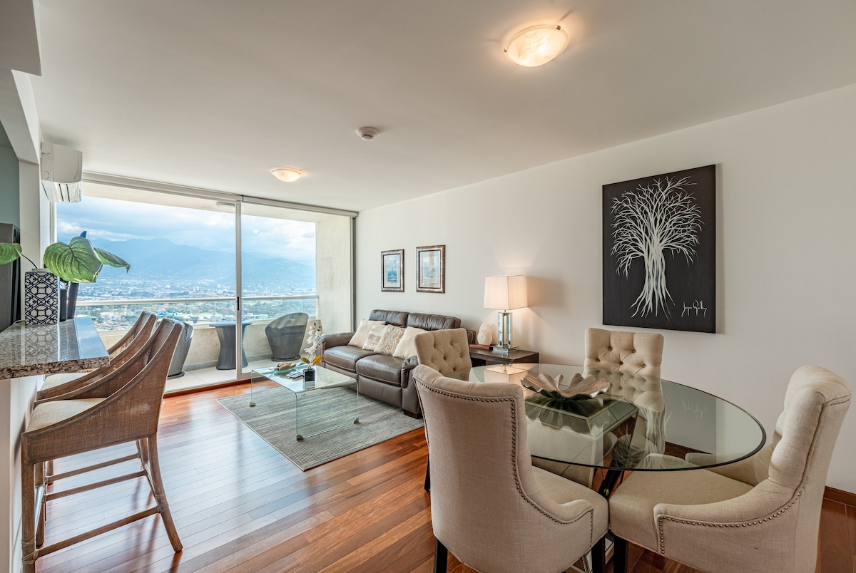 ¡Hola! Disfruta de comodidad y vistas impresionantes a solo 15 min del aeropuerto. Restaurantes, piscina, gimnasio, TV con ChromeCast, cama queen, espacio para trabajar, cocina completa y baño con agua caliente. Nuestro espacio es perfecto para que disfrutés tus días en un acogedor apartamento, a tan solo 15 min del centro de San José y muchos oficentros. Ema y Migue!