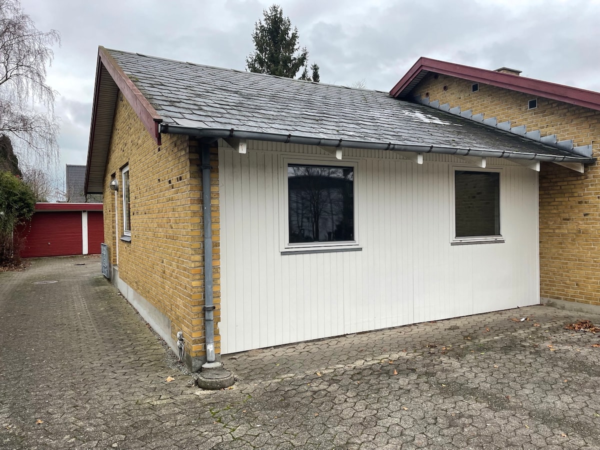 Perfekt lejlighed på 25m2 med hems på 10m2, hvortil der fører en udtræksstige. Lejligheden er optimal til 2 pers, dog mulighed for 4 overnattende gæster. Til forretningsrejsende der har brug for et roligt sted at arbejde. Eller hvis du vil have et weekend ophold. Faciliteterne er moderne i hjemmelige og rene omgivelser. Selve boligen ligger i forlængelse af ejendom i et villakvarter. Når du/ I booker er der sengetøj til det antal gæster der er reserveret til, inkl. håndklæder.