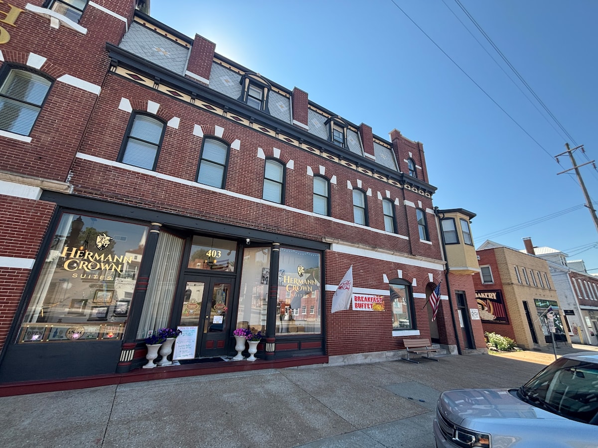 Justo en el centro/a poca distancia de tiendas, restaurantes, bares/desayuno bufé gratuito/entradas para bebidas gratuitas/transporte gratuito desde y hacia la estación de tren/música en vivo hasta octubre/patio grande/cocina al aire libre/bar subterráneo Hermann 1837 en el lugar/distrito de música y entretenimiento Hermann/transporte personalizado a bodegas/destilerías por 25 dólares. ¡Disfruta de la cama tamaño king/baño privado/wifi/café/cable! ¡Suite reconfortante llena de recuerdos de corazón/amor! En el segundo piso (18 escalones hacia arriba). Parte del Hermann Crown Suites 1899 Hotel.
