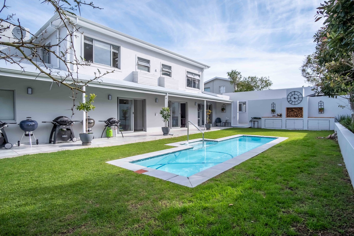 Mimosa Retreat en Voelklip, Hermanus, es un elegante refugio con 4 dormitorios, 5 baños y espacios de estar versátiles en tres niveles, con capacidad para 9 personas. Esta propiedad cuenta con piscina cristalina, wifi de alta velocidad, amplios patios, zona de bar, equipo de gimnasio, chimenea interior y múltiples áreas braai, ideal tanto para el entretenimiento como para la relajación. La cocina totalmente equipada y varios salones ofrecen un amplio espacio, por lo que es perfecta para una experiencia vacacional de lujo.