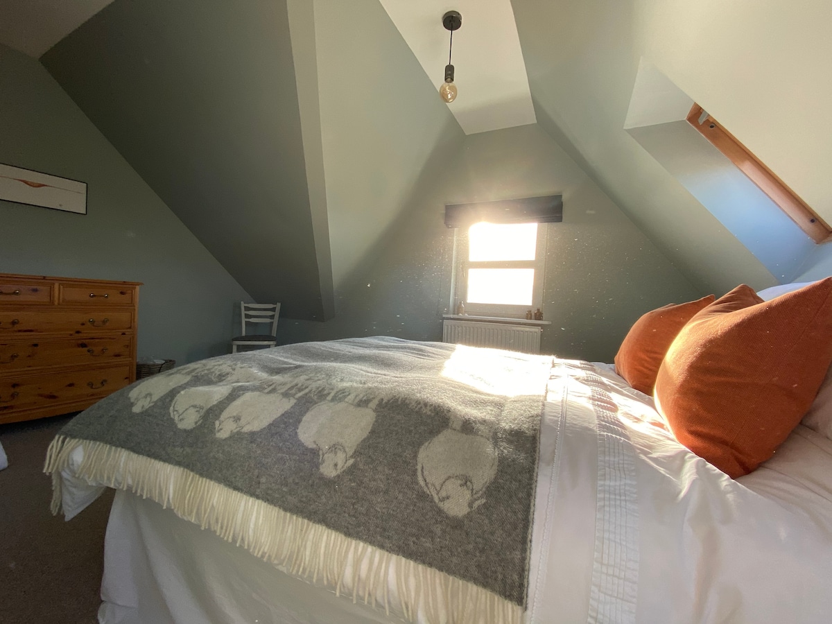 Conectado al antiguo granero de madera, este es un dormitorio compacto, acogedor y autónomo. Se encuentra a un lado del patio con acceso con llave independiente para que puedas entrar y salir a tu antojo. Si te encanta el aire libre, creemos que te encantará aquí. Tenemos unas vistas espectaculares de las montañas Cairngorms, con excelentes paseos desde la puerta. Rústica, con mucho carácter, la habitación tiene una cómoda cama tamaño king y baño privado con ducha. Si necesitas comodidades modernas o mucho espacio, ¡puede que este no sea el lugar ideal para ti!