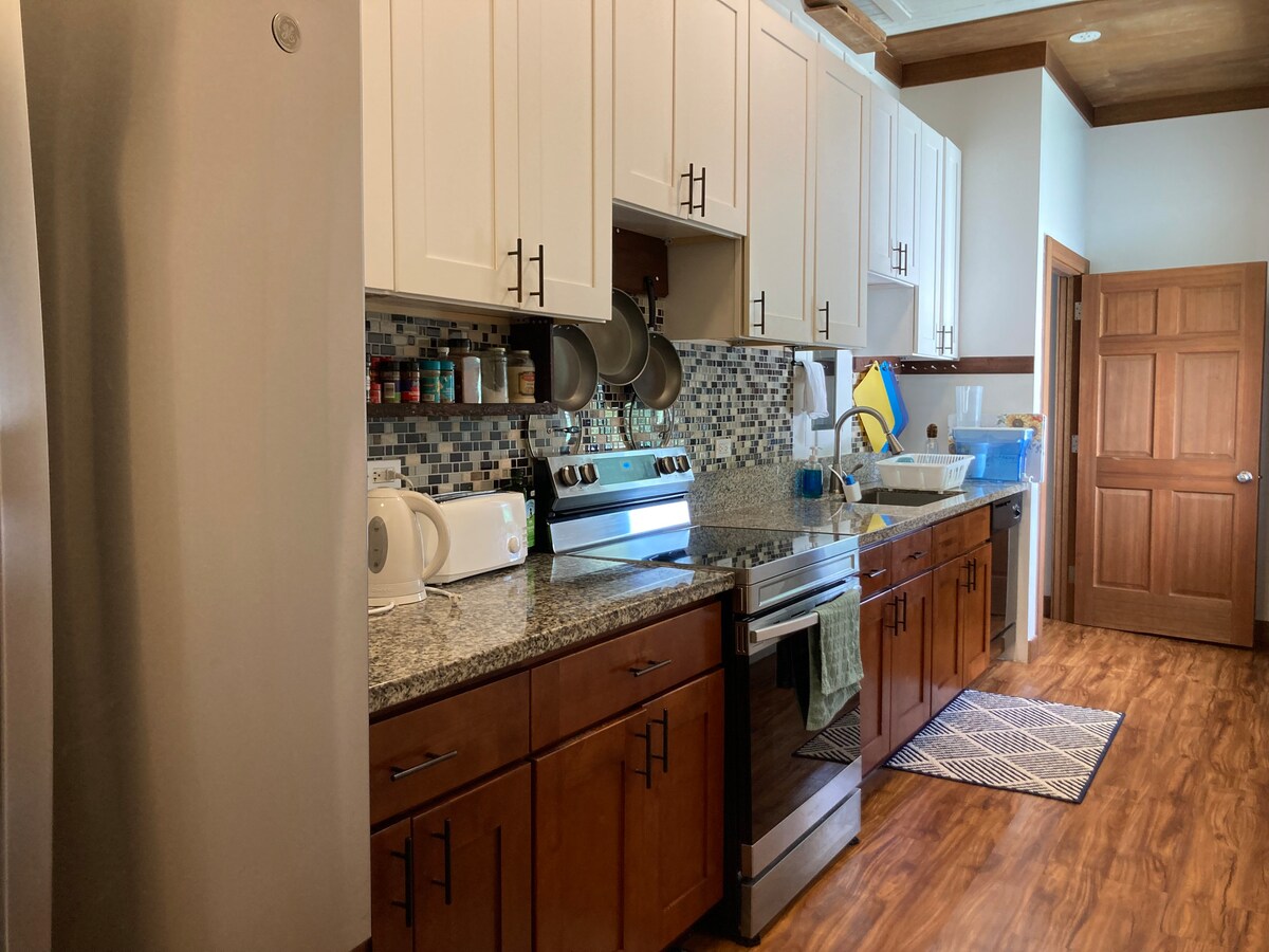 La suite es muy espaciosa (500 pies cuadrados), ubicada a menos de una milla del centro de Hilo en una propiedad privada de 1,7 acres. La casa está decorada con pisos de madera y amueblada con buen gusto, incluida una cama tamaño queen. La habitación tiene entrada privada, baño privado y terraza privada con vistas a un hermoso valle con una pequeña cascada. La unidad tiene acceso a un mirador cubierto con una zona de cocina compartida para barbacoa.