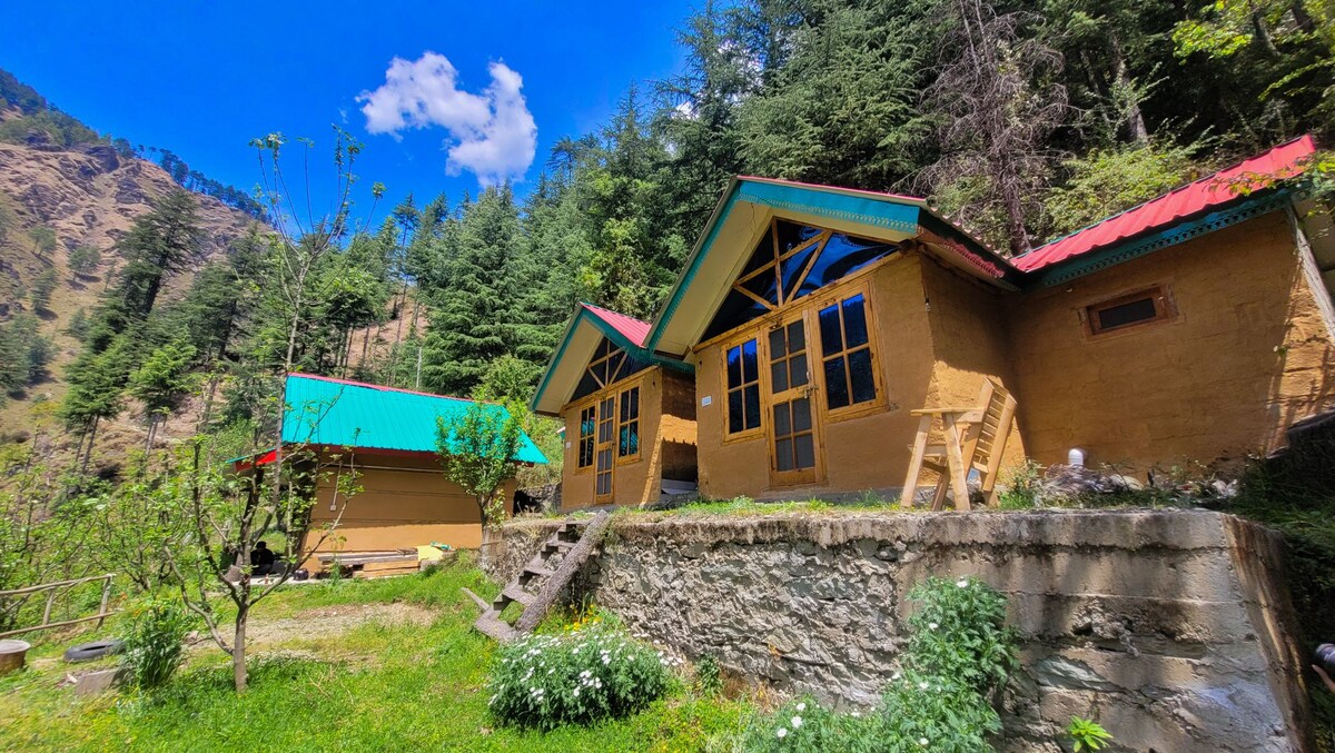 Hi! The cabin is a pvt. unit on our land, made naturally w exquisite sunset, snow clad peaks & Beas river views. Naggar is the widest part of the Kullu valley with breathtaking views & we are centrally located here. The Naggar Castle, Tripura Sundari & Krishna temple are nearby. Manali & Vashisht are 20 km. We also serve homely vegetarian meals & snacks at our home. We aren't a commercial hospitality unit, but an alt space for artists & anyone who is looking for a different travel experience.